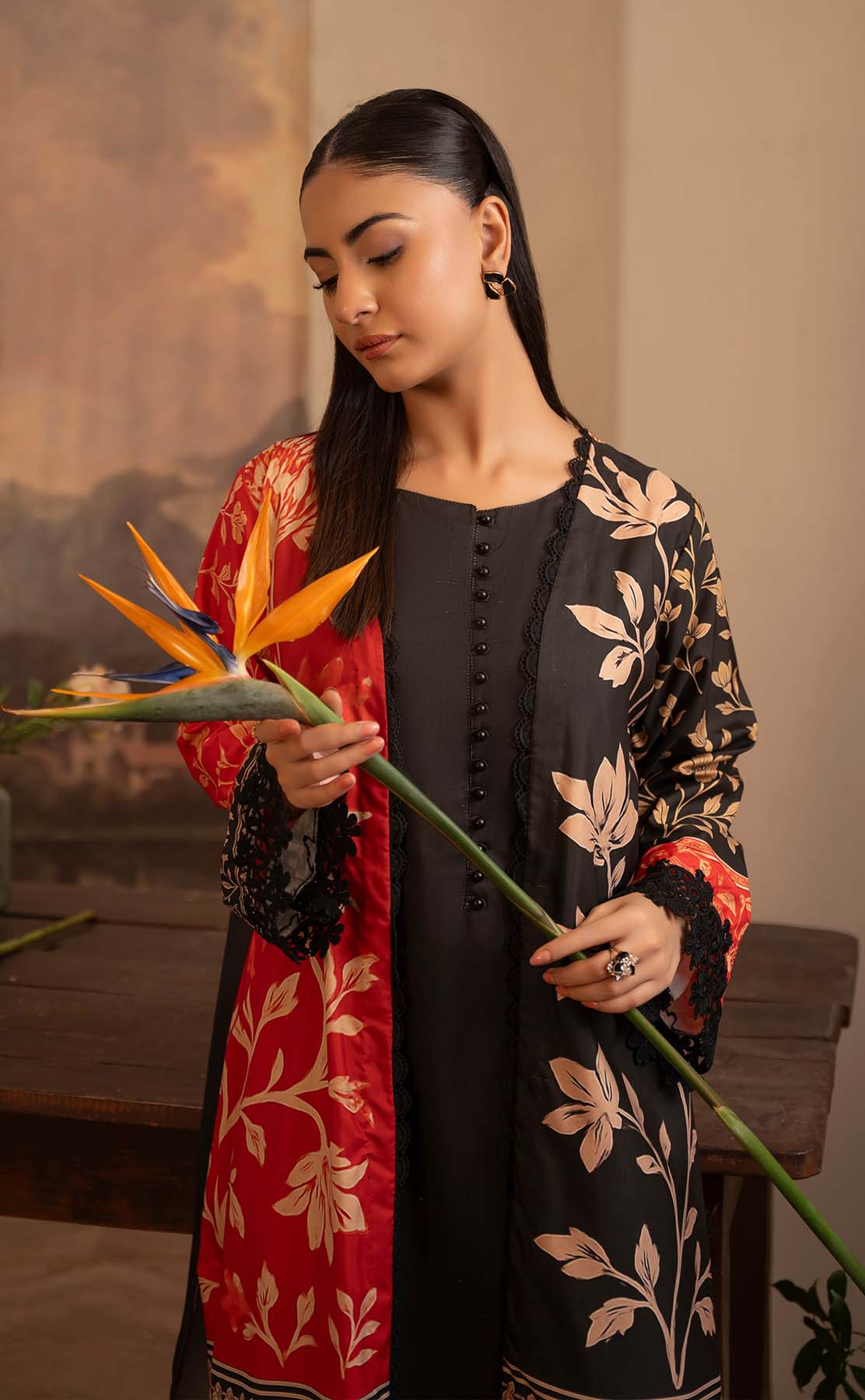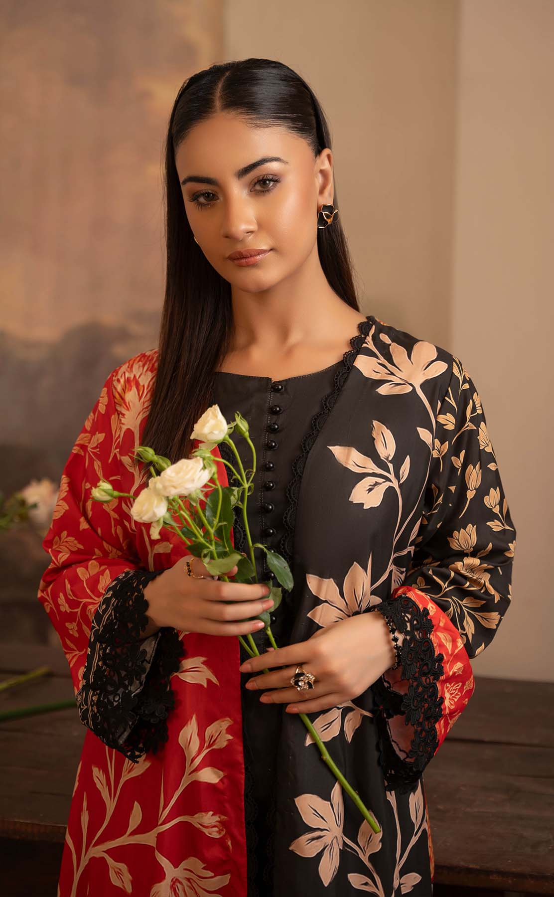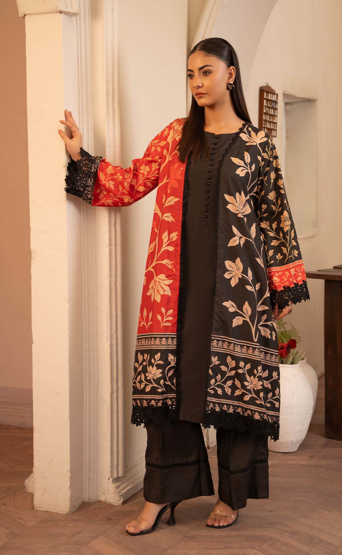 A luxurious two-tone gown-style ensemble in rich crimson and black, highlighted with intricate beige botanical motifs for a striking contrast. The front-open gown cut is finished with fabric-covered buttons, while straight black trousers with a layered hemline add sophistication. Blending timeless charm with modern elegance, it’s a perfect choice for festive and evening occasions.