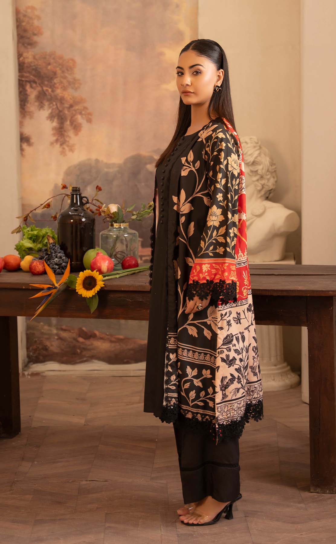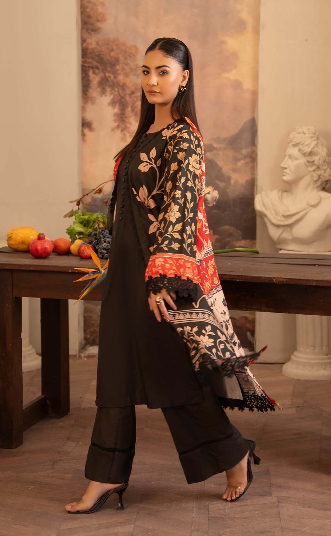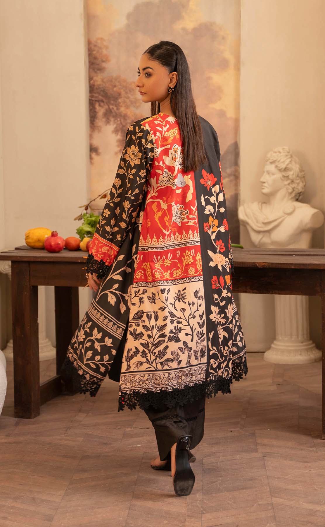 A luxurious two-tone gown-style ensemble in rich crimson and black, highlighted with intricate beige botanical motifs for a striking contrast. The front-open gown cut is finished with fabric-covered buttons, while straight black trousers with a layered hemline add sophistication. Blending timeless charm with modern elegance, it’s a perfect choice for festive and evening occasions.