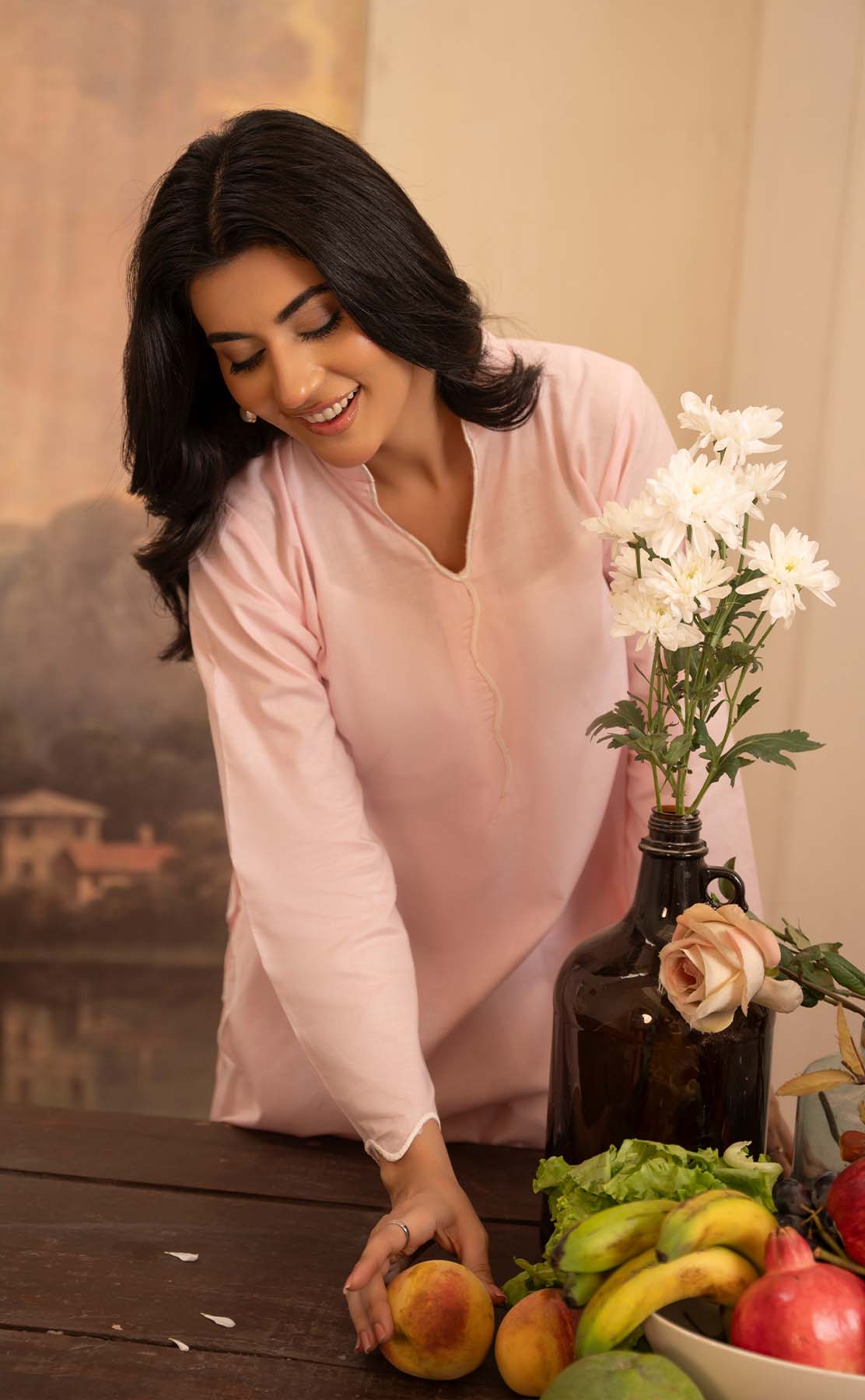 Article Code: LM-029Color: Light Pastel PinkFabric: GripCut: Straight Shirt with Scalloped EdgesNeckline: V-Cut Mandarin Style