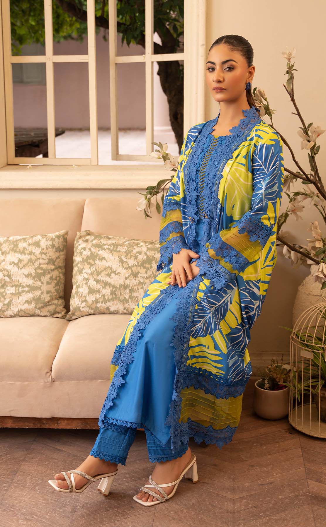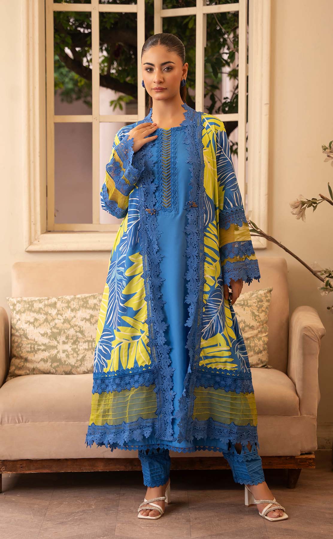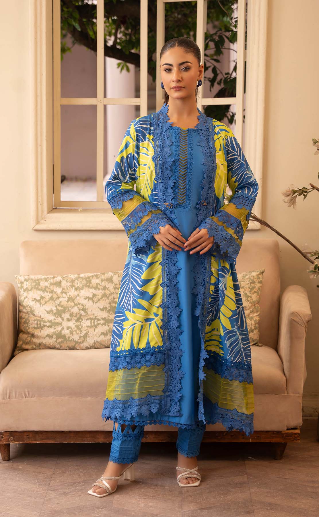 A vibrant blue poly lawn outfit adorned with lime-green and navy tropical leaf patterns, styled with a jacket-style overlay and lace-trimmed sleeves. Paired with matching blue trousers featuring lace cutwork, it’s a refreshing choice for summer days, festive brunches, or seaside gatherings.