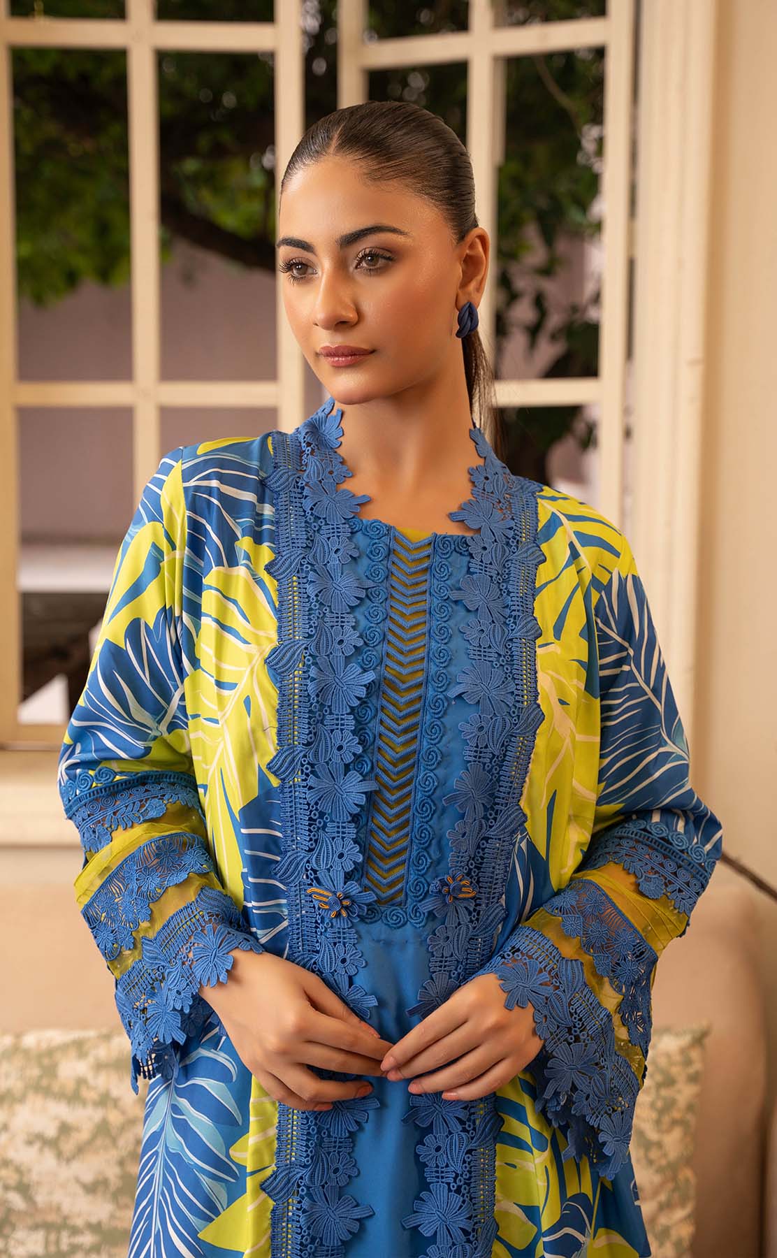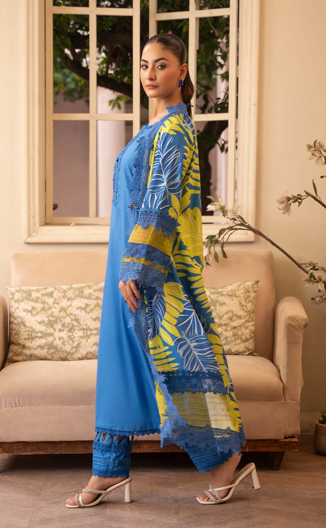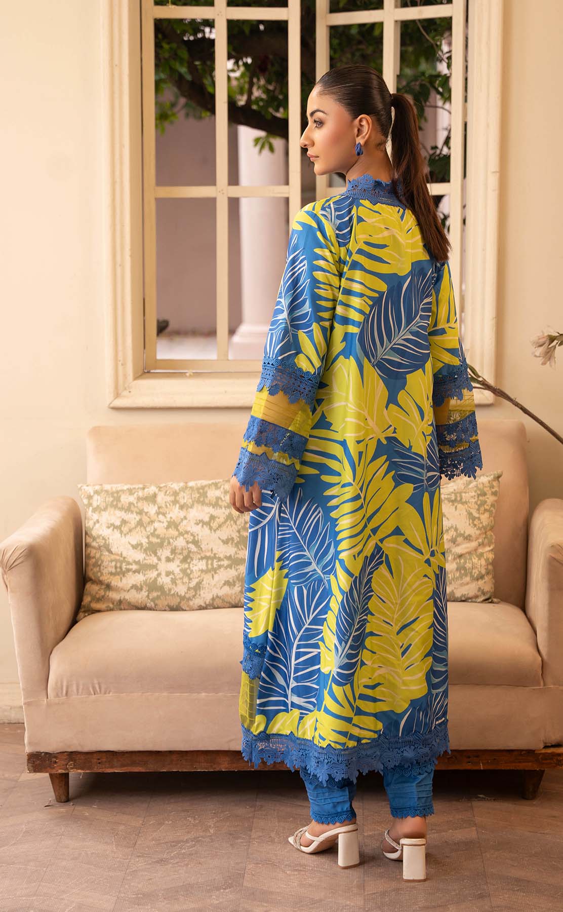 A vibrant blue poly lawn outfit adorned with lime-green and navy tropical leaf patterns, styled with a jacket-style overlay and lace-trimmed sleeves. Paired with matching blue trousers featuring lace cutwork, it’s a refreshing choice for summer days, festive brunches, or seaside gatherings.