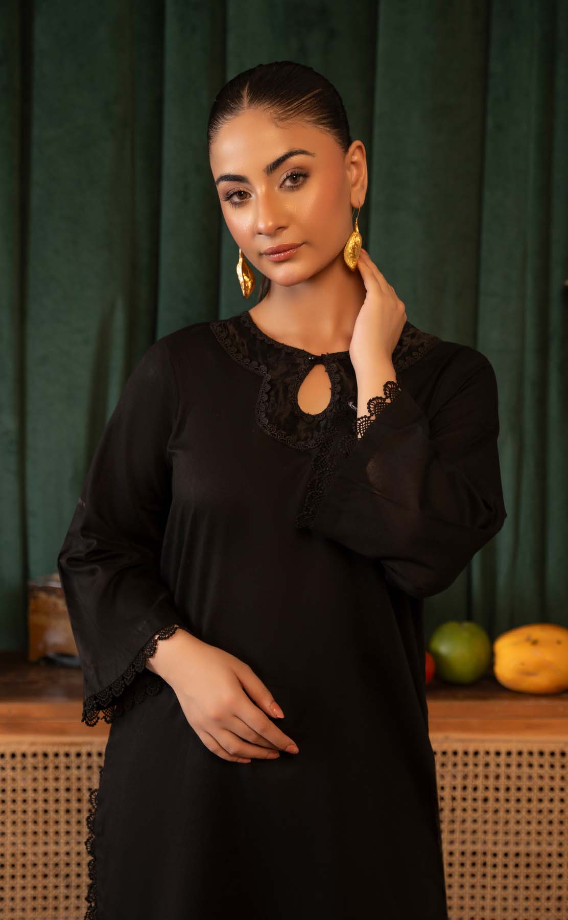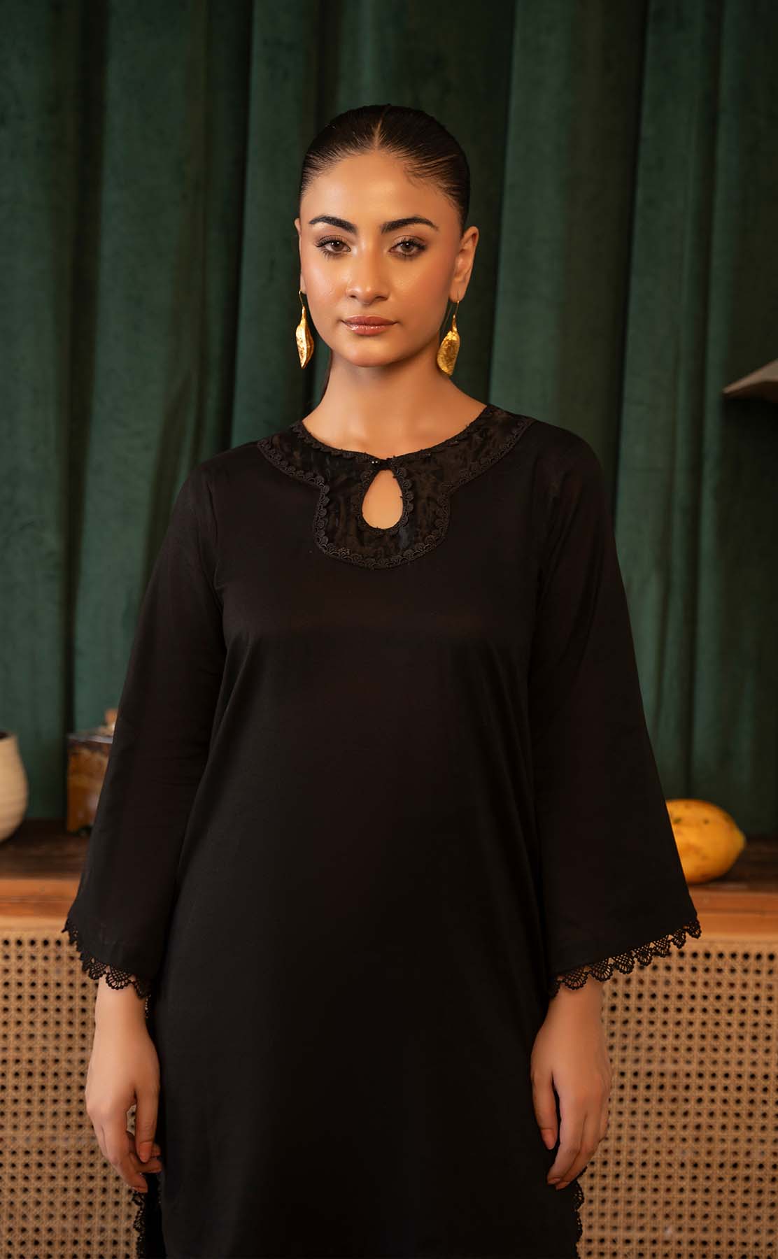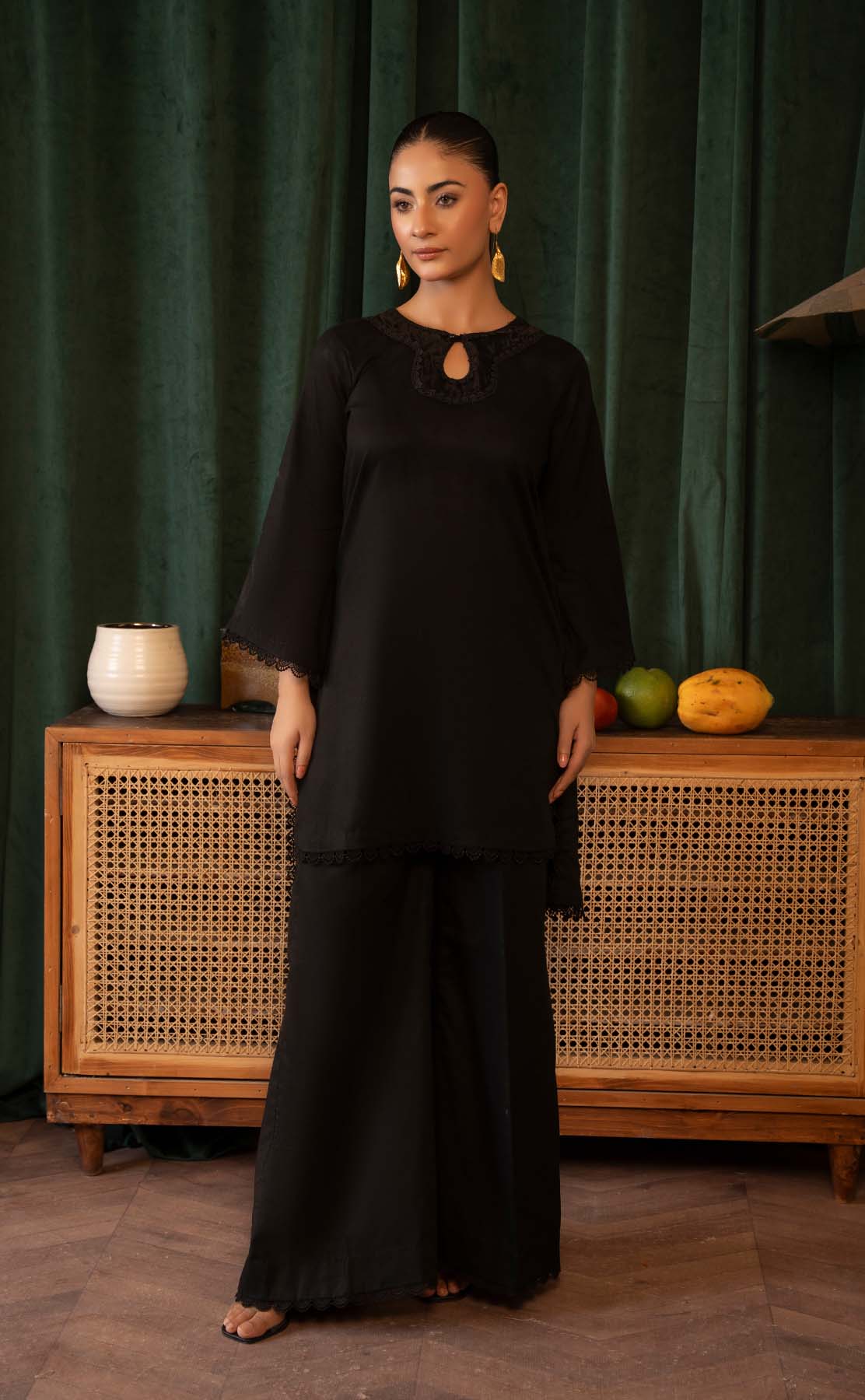 A chic short black shirt in grip fabric with a delicate keyhole neckline framed by subtle embroidered edging, styled in a relaxed silhouette. Paired with wide-leg trousers finished with scalloped lace borders, it embodies minimal grace with timeless elegance.